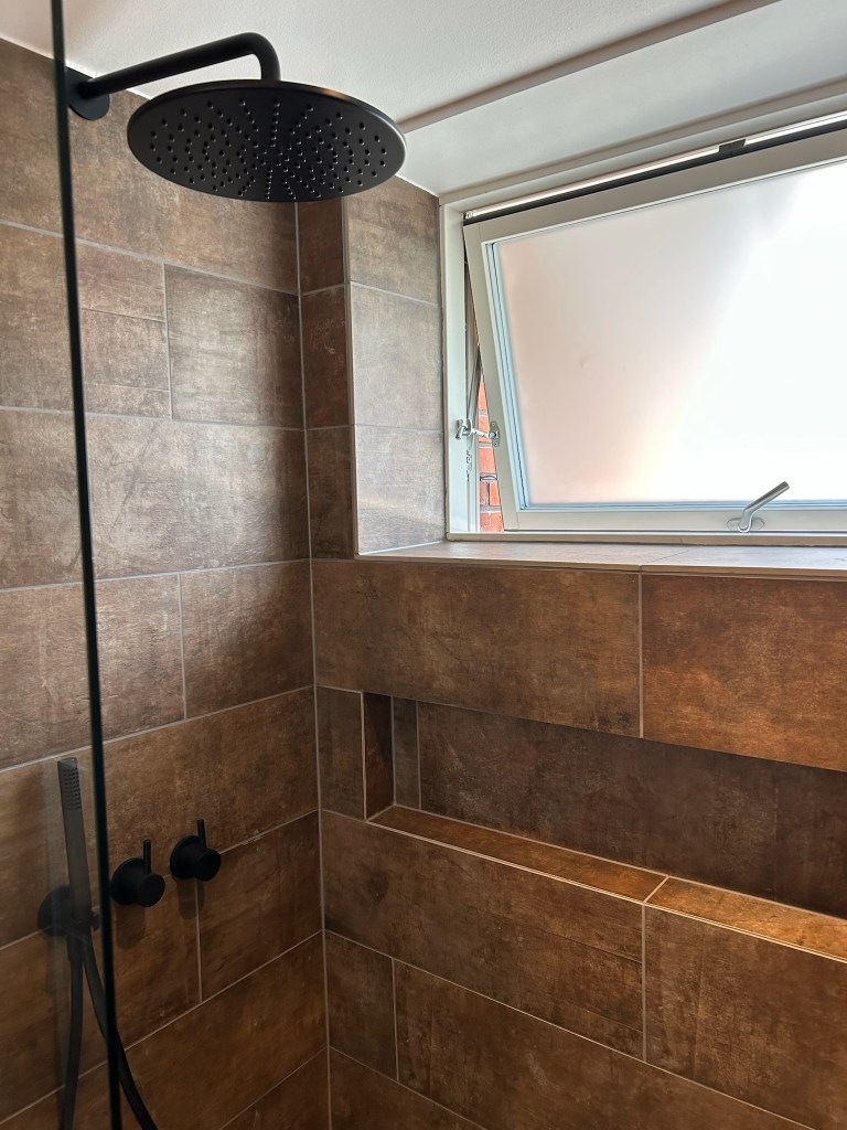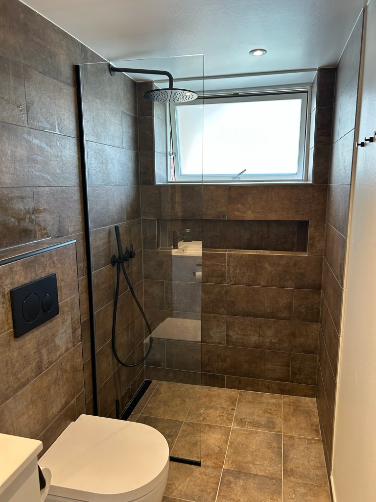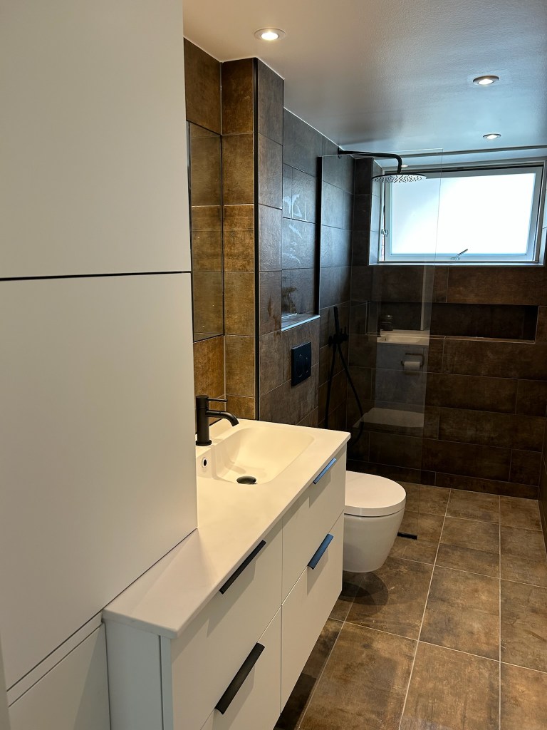 Badeværelse med ønske om bedre udnyttelse af kvm med lækre materialer og detaljer der skaber et personligt udtryk.